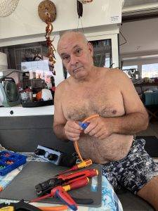 After returning the car, work on the boat continues. Fortunately, these are only improvement projects, not repairs. Axel is installing a flushing system for the air conditioning. Since we cool with seawater, unpleasant odors quickly form in the hoses when not in use. Now, at the end of the cooling period, we can simply flush with fresh water and also clean the hoses with detergent. So that we can connect our infrared heater directly to shore power during the heating period, Axel is installing a bypass power line and socket. This will allow us to heat at night without having to run the humming inverter. The watermaker is being relocated, thoroughly cleaned, and decommissioned for the rest of the season. Last but not least, the sailmakers at Dunes pick up our sails, check them for damage, and clean them thoroughly. We have the genoa remade and keep the old sail as a spare. In addition, the cockpit trim of our steering cockpit is fitted with new windows. The old ones were simply no longer transparent and had become brittle in places due to UV rays and heat. Our winter garden is also checked and made fit for the next few years. As a preventive measure, we replace our main halyard because it has a chafing spot and also discover a missing screw on the forestay profile. These are small things that can quickly become quite annoying and expensive if they break on the high seas.