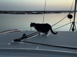 Nach einer erneut ruhigen Nacht, nur durch die üblichen Miau-Einlagen von Lucky unterbrochen, gehen wir den neuen Tag geruhsam an. Hier in Portugal ist Feiertag und entsprechend viel Freizeit-Bootsverkehr ist unterwegs. Wir lassen uns davon nicht stören, denn hier am Ankerplatz herrscht nur ein Bruchteil von dem Verkehr, wie zuletzt in El Rompido. Nachdem wir den Vormittag erfolgreich vertrödelt haben, machen wir am Nachmittag eine kleine Dinghyausfahrt. Wir folgen dem Fahrwasser weiter in die Lagune hinein. Vorbei am Flughafen Faro und zum Praia de Faro. Dort hat der Massentourismus zum Glück noch nicht Einzug gehalten. Die Dühne zum Atlantik ist über eine Brücke oder per Fähre zu erreichen. Große Hotelanlagen gibt es nicht, dafür Zeltplatz und Hostels. Unser Versuch anzulanden scheitert leider, da wir vorher auf Grund laufen. So geht es unverrichteter Dinge wieder zurück zu La Ola, wo wir die Hitze des Nachmittags im Cockpit aussitzen. Am Abend wird es zum Glück ein wenig kühler und ich kann im Frontcockpit mal wieder ein wenig Ukulelespielen üben. Außer den Störchen und Reihern in den Marschseen neben unserem Ankerplatz, störe ich damit auch keinen. Zum Sonnenuntergang sitzen Axel und ich dann mal wieder auf dem Dach. Allerdings dreht La Ola uns heute mal nicht in Blickrichtung Sonne, sondern lässt uns die Weite der überfluteten Wasserlandschaft genießen. Lucky gesellt sich dabei zu uns und begutachtet alle Ankerlieger neben uns äußerst interessiert.
