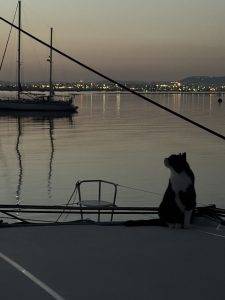 Der nächste Morgen startet mit einer ebenso schönen Morgendämmerung. Man muss nur Glück haben, dass man von Lucky rechtzeitig genug geweckt wird, damit man das Farbspiel genießen kann. Aber eigentlich funktioniert der Katerwecker sehr, sehr zuverlässig. So auch heute. Nachdem Lucky die meiste Zeit der Nacht bei uns im Bett gekuschelt hat, knurrt wohl um 6:30 Uhr der Katermagen so laut, dass er mich wecken muss. Die Sonne gibt auch heute mal wieder alles und färbt den Himmel kitschig-rot. Während Lucky sein Frühstück genießt, bewundere ich den sichelförmigen Mond mit den beiden hell-leuchtenden Planeten Jupiter und Venus neben ihm. Der Tag startet ansonsten ruhig. Nach schönen Tagen vor Anker, wo wir die Hitzewelle sehr gut ertragen konnten, geht es heute ein kleines Stück weiter. Wir haben für die nächsten Tage einen Liegeplatz in der Marina von Olhâo ergattern können und verholen am späten Vormittag das kurze Stück nach Osten. Bei der Fahrt durch die Lagune fällt uns auf, wie schön sauber und Müllfrei die Ufer und das Wasser sind! Im Gegensatz zu den Marismas del Odiel, wo jeder Quadratmeter des Marschwiesenufers mit Pladtikmüll bedeckt war, sieht man hier rein gar nichts am Ufer liegen. Wenn mal doch eine Plastikflasche im Wasser schwimmt, halten die Ausflugsboote an u d sammeln sie ein. Ach, wenn es doch überall auf der Welt ein solches Verhalten gäbe! Das Wasser der Lagune ist bei auflaufender Tide superklar und zeigt sich in karibischen Farbfacetten, von türkis bis dunkelblau. Erstaunlicherweise dreht der Wind während unserer Fahrt auf Südwest und bläst mit 4-5 Windstärken, obwohl eigentlich Nordwest 2-3 vorhergesagt war. An sich nicht schlimm, wenn man nicht gerade in einem sehr engen Hafen anlegen müsste. Obwohl wir bereits alle Bootsunterlagen und unsere Daten bei der Reservierung eingereicht haben, müssen wir erst an den Rezeptionssteg. Der ist allerdings belegt, so dass wir kurzerhand am Fähranleger anlegen dürfen. Nicht einfach, denn der Wind drückt uns an Land und macht ein Wendemanöver unmöglich. Am Ende schafft es Axel aber mal wieder perfekt, checkt ein und steht dann wenig später vor der Herausforderung La Ola gegen den Wind von Steg wieder abzulegen. Auch dieses Manöver gelingt souverän und wir sind schnell auf dem Weg zu unserem zugewiesenen Liegeplatz. Wie fast nicht anders zu erwarten, bekommen wir genau den Liegeplatz zugewiesen, den man uns bereits vor einem Jahr als Winterliegeplatz angeboten hat. Und den wir damals dankend abgelehnt haben, da er direkt in der Einfahrt liegt und La Ola mit ihrem Backbordrumpf nun als verlängerte Steganlage in den Hafen ragt. Der Platz liegt „indisch“ – am Ende des Ganges. Bis an Land sind es 350 m überspülten und mövenbesetzten Außensteg entlang. Vor dem Steg sausen zahlreiche Motorboote, Wassertaxis und Ausflugsboote mit Highspeed entlang und sorgen für viel Lärm und Schwell. Nun ja, wir haben schon schlechter gelegen! wir erinnern uns da gerne an Rohuküla in Estland zurück. Allerdings haben wir selten so unruhig und weit entfernt für so viel Geld gelegen. Egal, wir haben es nicht anders gewollt und am Ende liegen wir auch direkt vor den hübschen Markthallen und in unmittelbarer Nähe der Innenstadt. Nachdem La Ola gut und sicher festgemacht ist, nehmen wir unsere Fahrräder und fahren an Land. Erster Stopp: das kleine Rstaurant Cais Club, direkt gegenüber von unserem Liegeplatz. Dort gibt es leckeres Hühnchen Piri-Piri für Axel und gegrillten Sepia für mich. Gut gesättigt geht es weiter zu. Lidl, der sich außerhalb der Stadt befindet, Nicht ganz einfach mit dem Rad zu erreichen, aber am Ende finden wir einen Weg und können unsere Frischvorräte an Brot, Eiern und Orangen gut aufstocken. Zurück an Bord hat sich der Wind vom Vormittag komplett gelegt und die Sonne hat das Cockpit mummelig augeheizt. Zum Glück konnten wir auch den Eisvorrat bei Lidl aufstocken und genießen wenig später leckeres Pfefferminzeis am Stil. Bis Anfang September bleiben wir nun erst einmal in Olhâo und werden hier die nähere Umgebung erkunden. Axel fliegt zur Hochzeit von Laura und Lars nach Deutschland. Ich habe meine Nichte Svea an Bord zu Besuch. Die ersten Aktivitäten habe ich schon im Blick. Vom Besuch der Jazzkneipe, über Solebaden in einer Saline bis zu einem geführten Naturkundeausflug in den Ria Formosa. Mal schauen, was wir so alles schaffen.