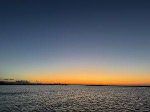 Der nächste Morgen beginnt bewölkt. Ein völlig ungewohnter Anblick! Und kühl, was noch ungewohnter ist. In der Nacht war es so frisch, dass wir uns tatsächlich in unsere Decken einkuscheln mussten, um nicht zu frieren. Dabei sind wir doch wegen der angekündigten Hitzewelle aus Huelva rausgfahren! Zum Glück währt beides nicht lange. Die Sonne brennt die Wolken schnell weg und wärmt auch gleich die Luft wieder an. Während wir noch überlegen, was wir als nächstes so machen wollen, kommt unser neuer Nachbar Hans von der El Kave auf einen Schnack vorbei. Er ankert mit seiner Frau schon seit zwei Wochen hier und ist ebenfalls in einem trödeligen Tempo wie wir unterwegs. Wir tauschen uns über Häfen- und Ankerplätze aus und schon ist es Nachmittag. Nachdem Hans sich mit seinem Dinghy zum Einkaufen an Land aufmacht, beschließen wir den Tag noch vor Anker zu bleiben und einen Ausflug mit dem Schlauchboot in die Marismas zu machen. Viel zu sehen ist allerdings nicht vom Schlauchboot aus. Wir tuckern nach links, sausen nach rechts und bergen einen kaputten Schwimmsitz aus dem Wasser ab. Wenigstens ein Stück weniger Plastik im Wasser. Leider schwimmt davon hier viel zu viel herum! Zahreiche Plastikflaschen und Dosen lassen einen über die Vorteile eines Dosen- und Einwegpfands nachdenken. Gibt es hier in Spanien leider nicht. Zurück an Bord halten wir uns gepflegt im Schatten, den die Sonne steht inzwischen wieder ordentlich heiß am Himmel. Den Tag beschließen wir mit einem netten Sundowner, Pulpo in Knoblauchöl und dem Ausblick auf einen immer größer werdenden Mond.